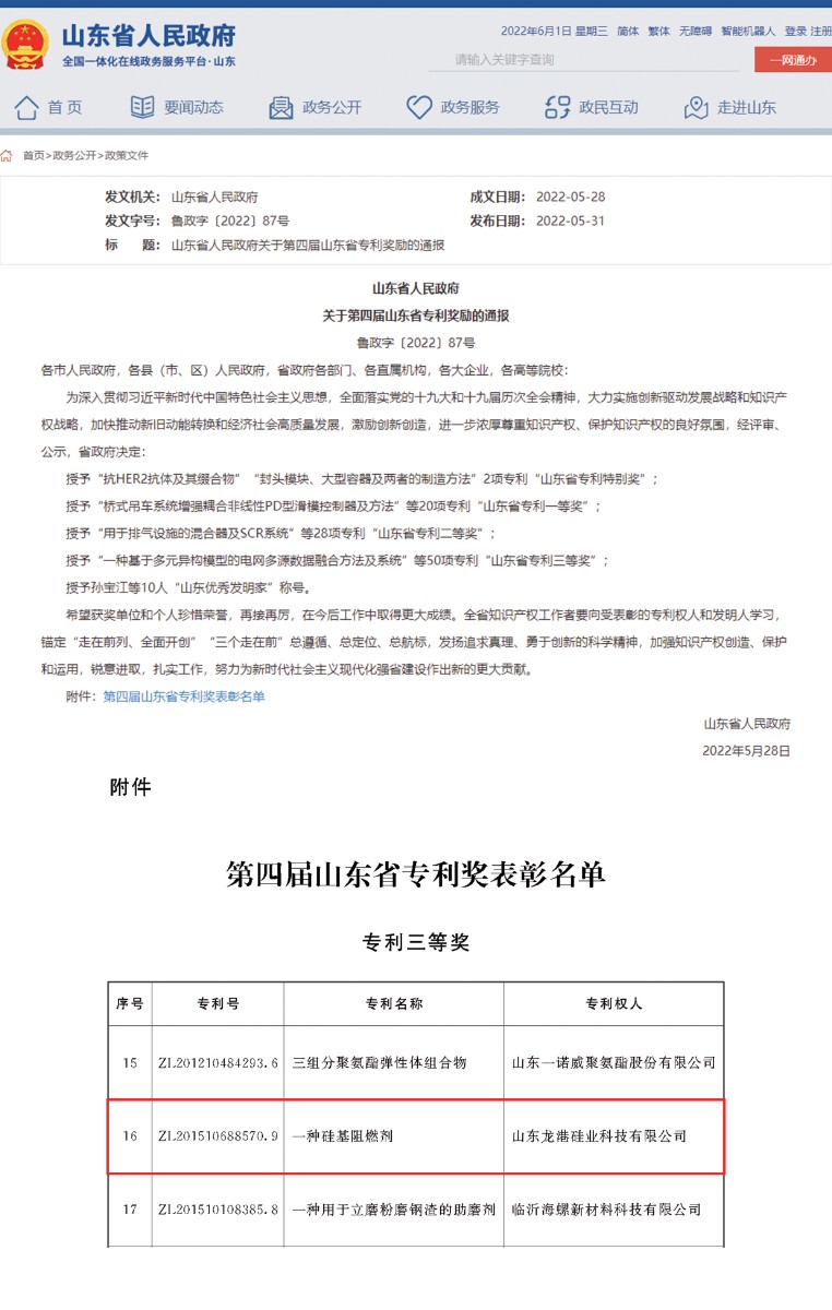 日前,山東省人民政府公布了第四屆山東省專利獎(jiǎng)獲獎(jiǎng)名單,山東龍港硅業(yè)科技有限公司的發(fā)明專利“一種硅基阻燃劑”被授予山東省專利獎(jiǎng)三等獎(jiǎng)。……